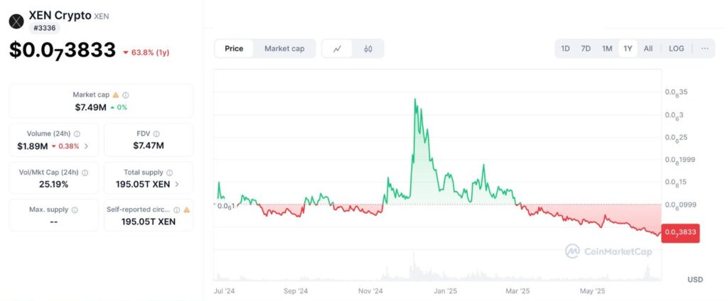 As of June 26 2025, XEN trades at ~$0.00000003384, up 0.15% in 24 hours, with a $1.89M daily trading volume and $7,49M market cap (195.19T circulating supply which is self reported), as per CoinMarketCap.