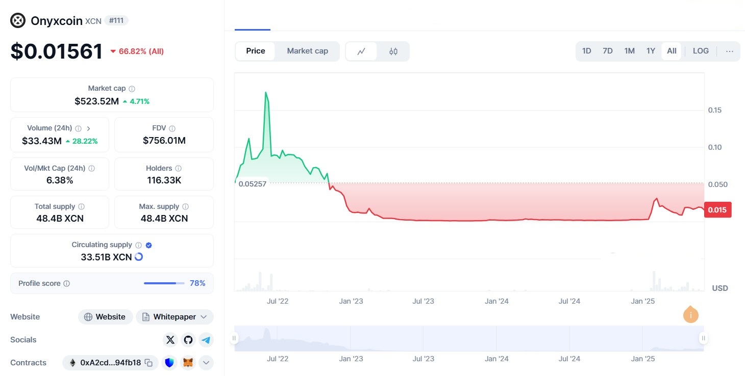 XCN Crypto operates on the Onyx blockchain, a Layer-3 protocol built on top of Ethereum, Base, and Arbitrum. Described as a “scalable and cryptographically secure Multi-Asset Ledger,” it facilitates DeFi applications and cross-chain interoperability. XCN serves as the native token, used for governance, transactions, and ecosystem participation. With a current market capitalization of approximately $500 million and a price range of $0.015 to $0.016 as of June 2025, it ranks among mid-tier cryptocurrencies as shown below.